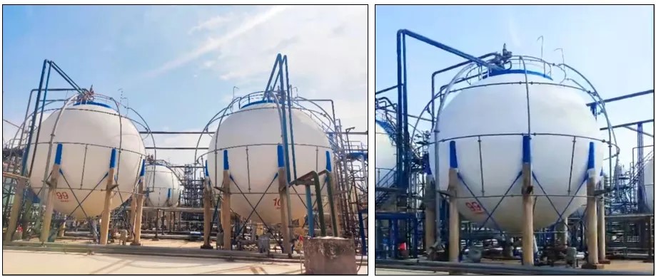 (1)成品油罐區(qū)技改項目中,針對丙烯球罐、丙烷球罐及液化氣球罐的隔熱需求,創(chuàng)新采用再生循環(huán)保溫材料實施整體隔熱改造。單臺球罐施工面積達2190平方米,改造后實測降溫幅度超12℃,顯著提升設備運行穩(wěn)定性,驗證了該材料在大型儲罐領域的優(yōu)異隔熱性能。